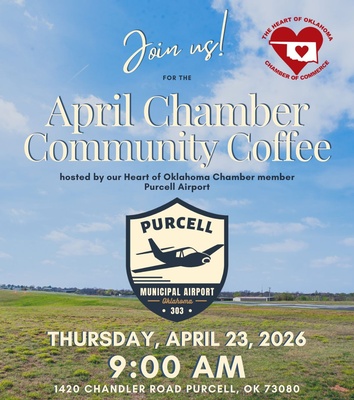 Join us for our next Chamber Community Coffee hosted by the Purcell Municipal Airport! Start your morning with coffee, conversation, and connection while networking with fellow Chamber members, local leaders, and community partners.